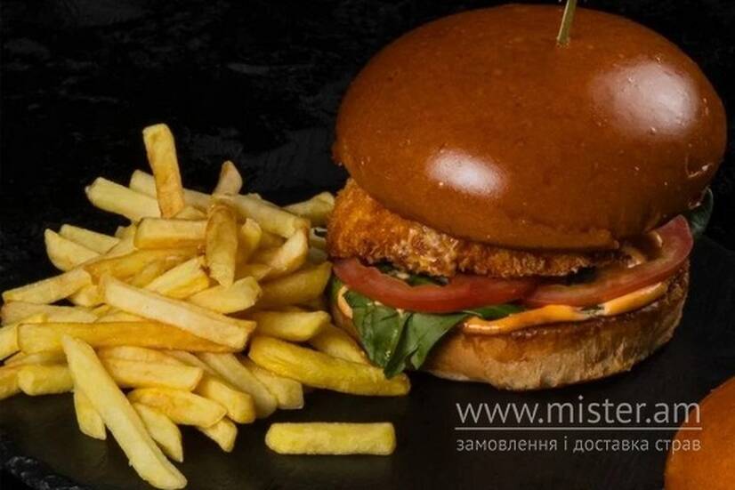 Булочка, куряче філе панко, бекон, соус барбекю, сирний соус, помідор, листя салату, корнішони, картопля фрі.