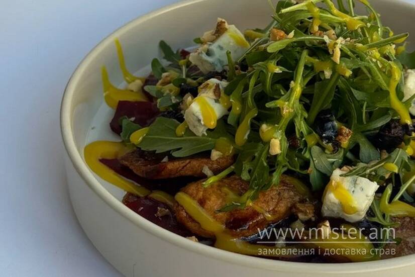 Буряк, філе куряче, рукола, сир Філадельфія, горіхи, чорнослив, медово-гірчичний соус, соус унагі.