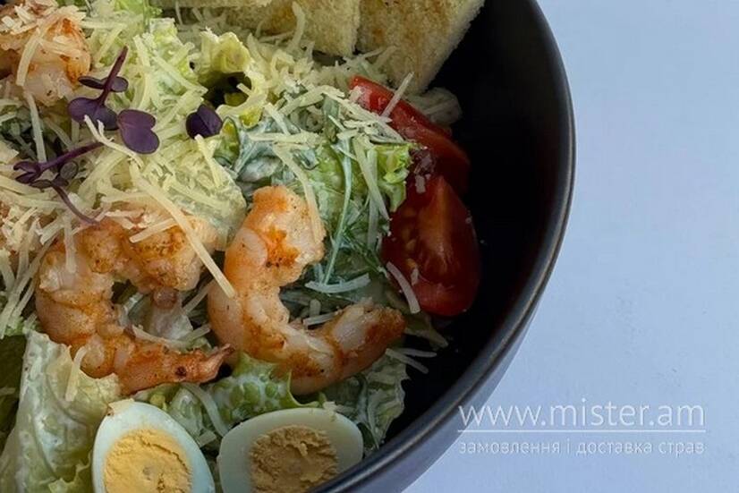 Мікс салату, креветки, помідори чері, перепелині яйця, грінки, пармезан, соус цезар.