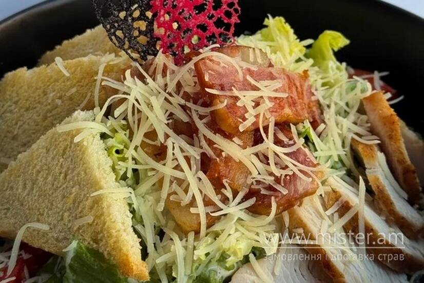 Мікс салату, філе куряче, бекон, помідори чері, грінки, пармезан, соус цезар.