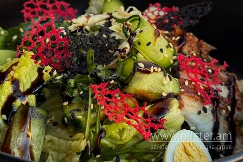 Мікс салату, вугор, огірки, перепелині яйця, кунжут, соус унагі, горіховий соус.