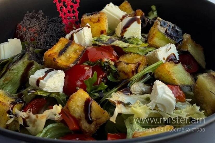 Мікс салату, баклажан, перець болгарський, помідори чері, фета, соус унагі, часниково-бальзамічний соус.