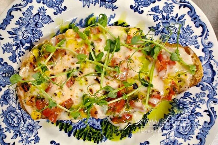 Тост із моцарелою, кукурудзою та помідором на хлібі з закваски. Смачний тост на хрумкому хлібі з закваски, щедро вкритий соковитими помідорами, солодкою кукурудзою та ніжною моцарелою.