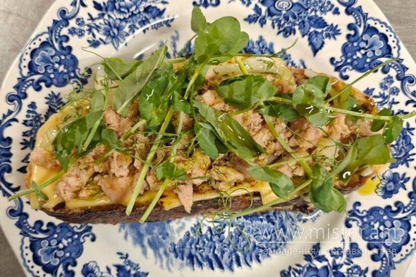 Тост з тунцем, яйцем та сиром гауда. Поживний тост з соковитим тунцем, вареним яйцем, скибочками цибулі та розплавленим сиром гауда.
