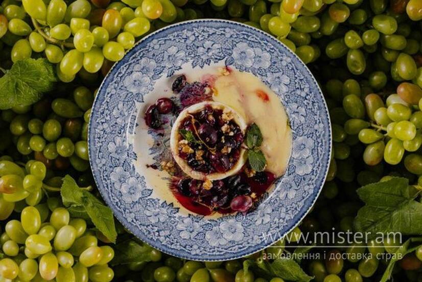 Ніжний запечений камамбер із запеченим соковитим виноградом, медом та грецькими горіхами. Легкі ноти тим`яну і вершкового масла створюють вишукану гармонію смаку, яка ідеально поєднується з келихом вина.