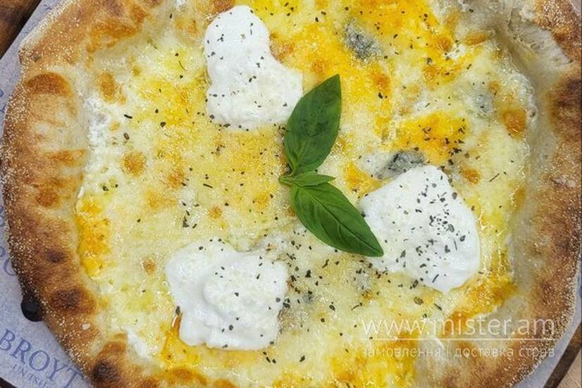5 видів сирів: моцарела, чедер, горгонзола, страчатела, пармезан, вершкова основа, базилік, ферментоване тісто.