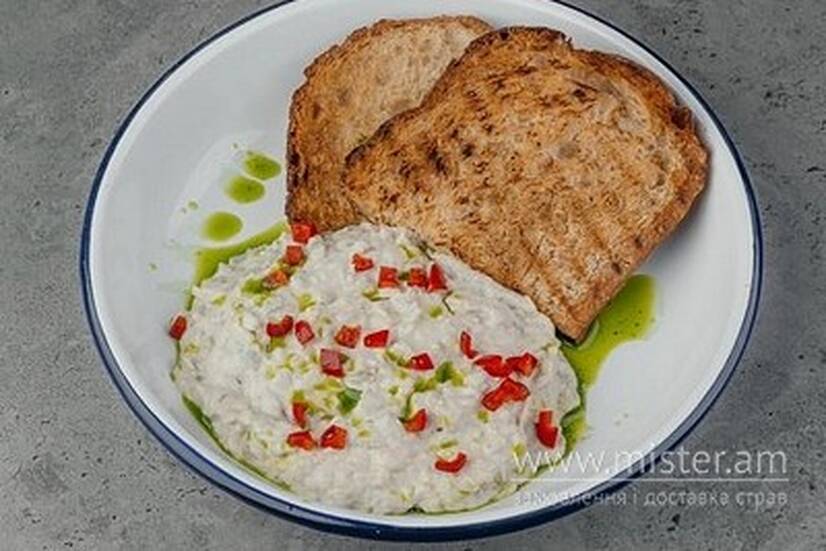 Намазка з печеного баклажану, перець чилі, зелена олія, грінки ферментованого хліба на заквасці.