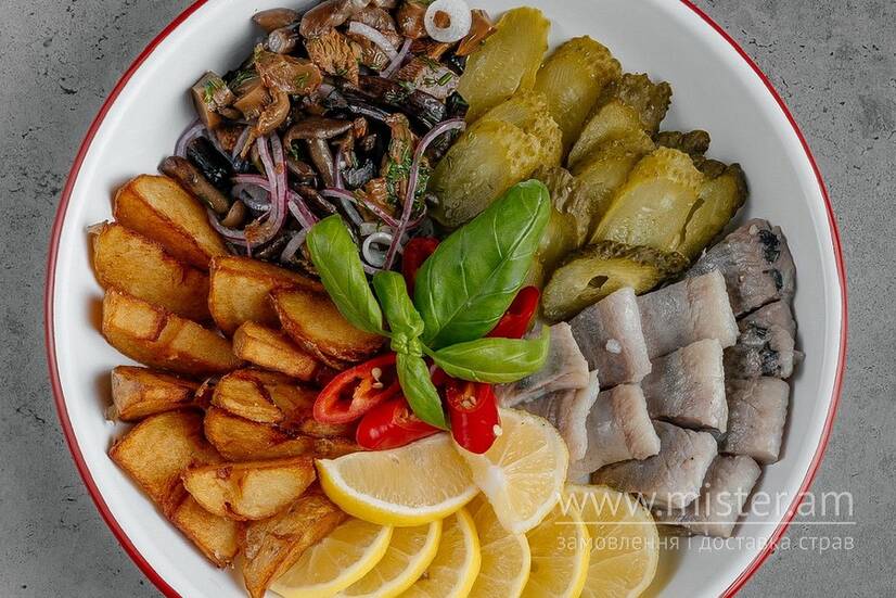 Оселедець, картопелька, мариновані опеньки, огірочки.