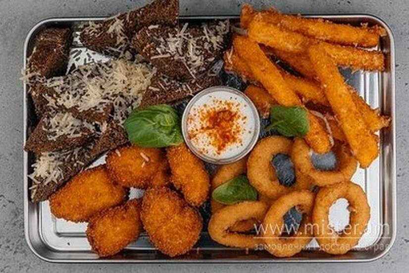 Сирні палички, цибулеві кільця, грінки з часником та пармезаном, курячі нагетси, соус "Цезар".