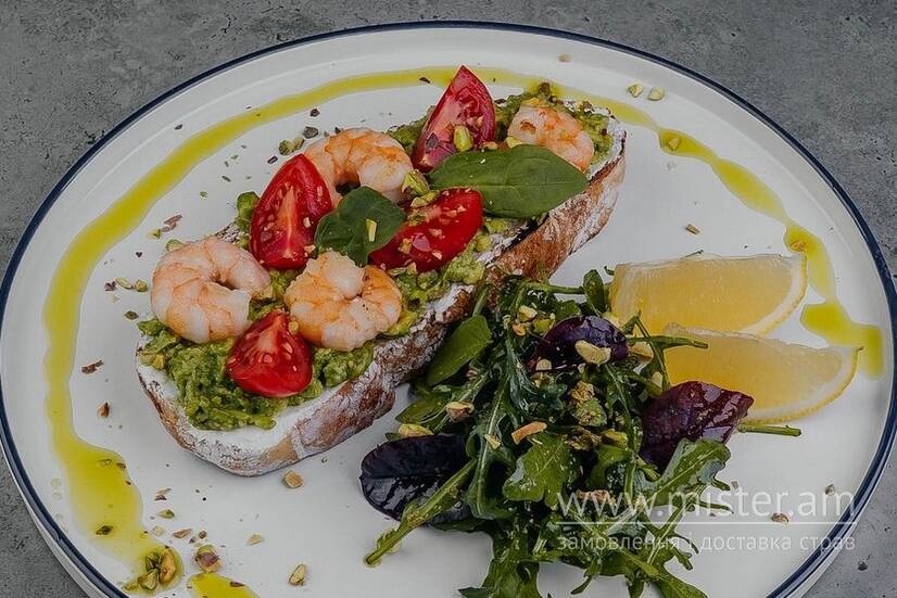 Хліб на заквасці власного виробництва, крем сир, авокадо, тигрові креветки, чері, мікс салатів, медово-гірчичний соус, лимон, крихта фісташок.