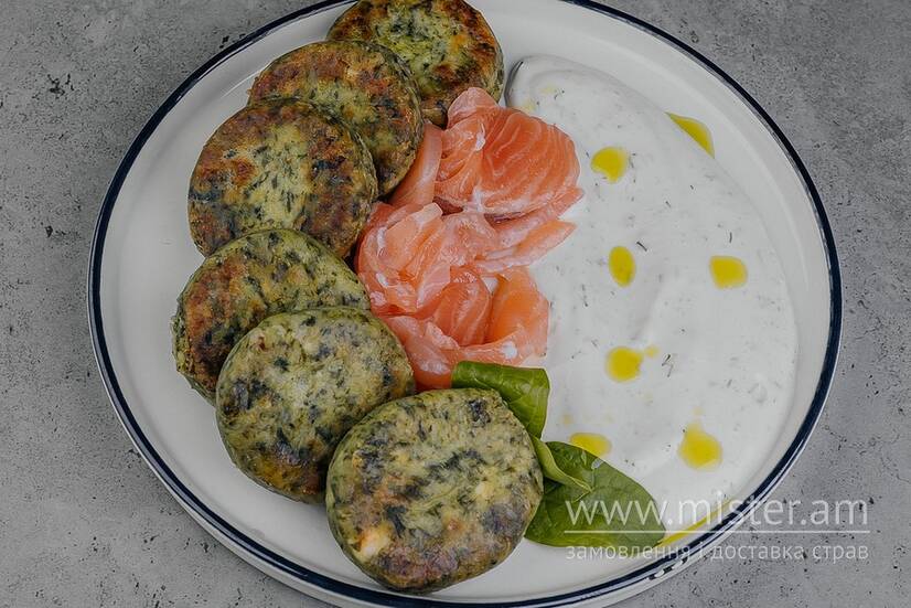 Шпинатні сирники, лосось слабосолений, соус вершковий, зелена олія.