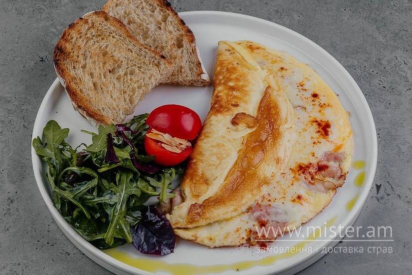 Омлет з двох курячих яєць, шинка, моцарела, мікс салатів, чері, хліб на заквасці власного виробництва, зелена олія.