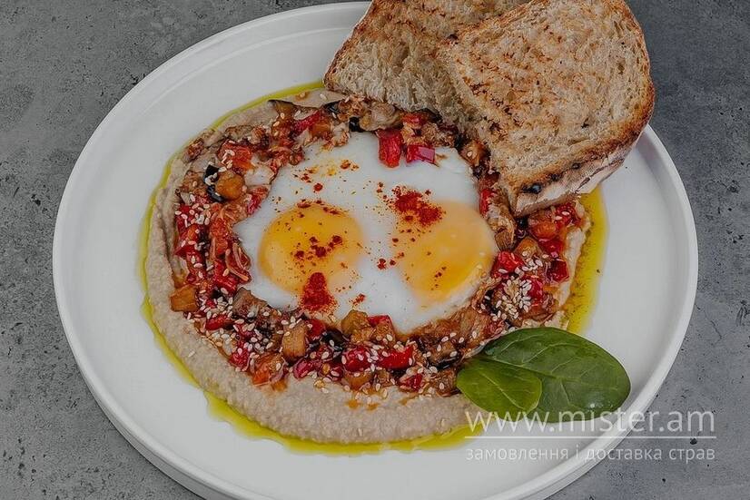 Хумус, шакшука з томатами, баклажаном, солодким перцем, курячі яйця, хліб на заквасці власного виробництва.