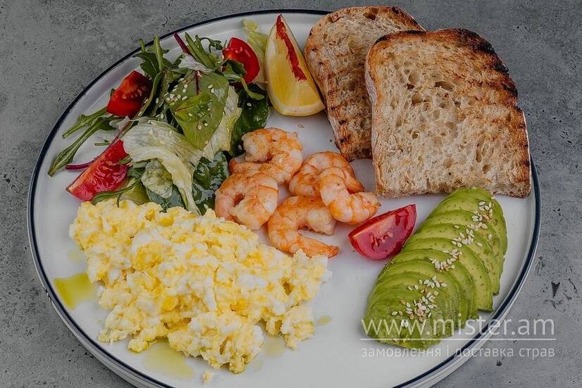 Скрембл з двох курячих яєць, креветки тигрові, авокадо, чері, мікс салатів, медово-гірчичний соус, хліб на заквасці власного виробництва, лимон, зелена олія, кунжут.