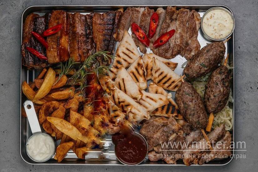 Свинні мʼясні ребра, стейки зі свинного ошийка, люля-кебаб, лаваші з сиром, картопля по-домашньому, соус Айолі, соус BBQ, соус Англійський.