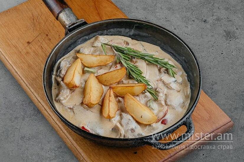 Телятина, курка та баклажан, перець болгарський червоний, печериці, кабачок під вершками, з картоплею.