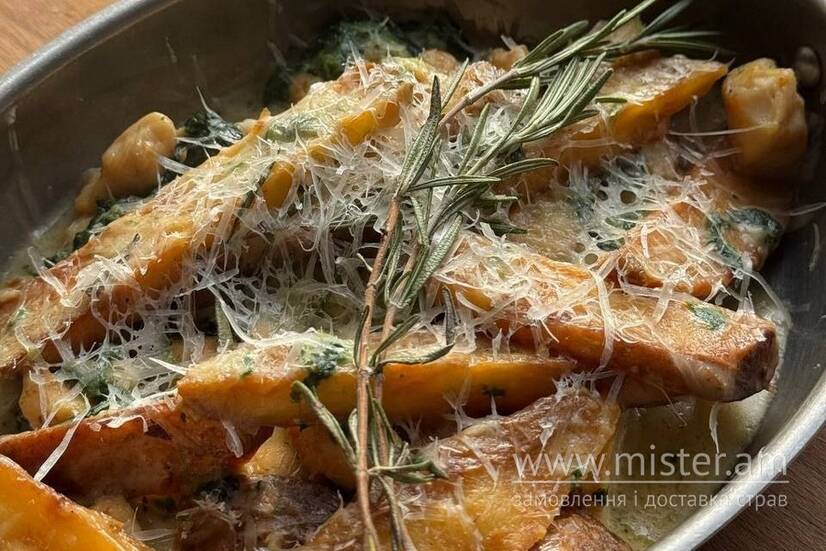 Куряче філе, картопля, шпинат, соус бешамель, пармезан.