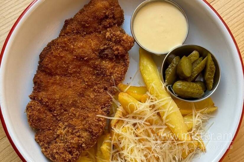 Куряче стегно в паніровці панко з картопляними діпами під пармезаном, сирним соусом та маринованими огірками.