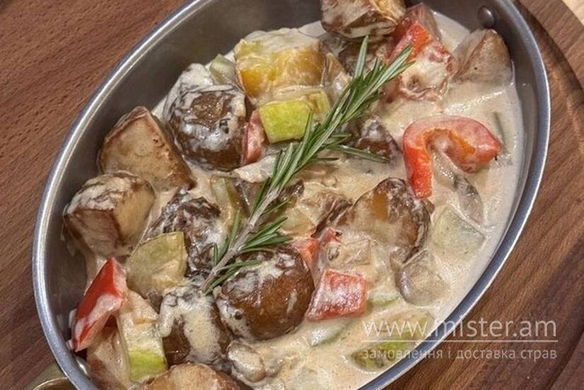 Картопля печена, болгарський перець, печериці, кабачок, вершки рослинні (пісні), соєвий соус.