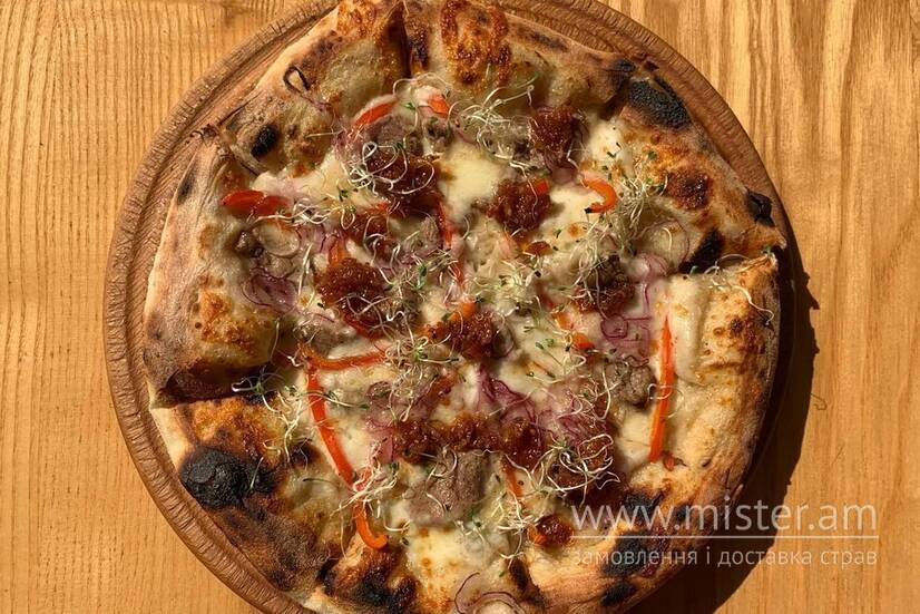 Телятина, болгарський перець, беконовий джем, моцарела, корнішони, синя цибуля, гострий перець.
