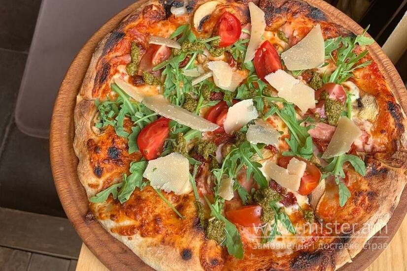 Ковбаса Чорізо, сир моцарела, соус бешамель, томати чері, пармезан, синя цибуля, петрушка.
