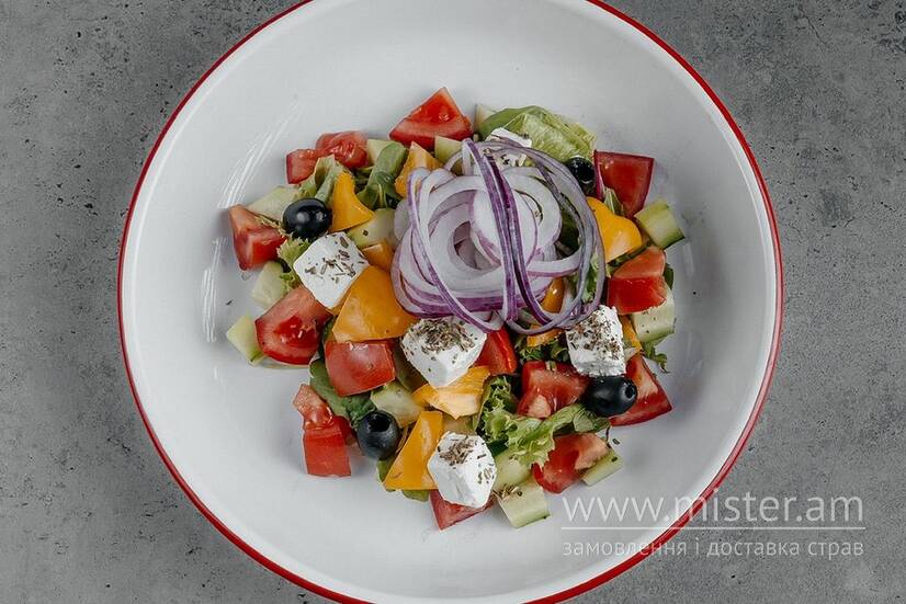 Помідори, огірки, болгарський перець, маслини, фета, синя цибуля, мікс салатів.
