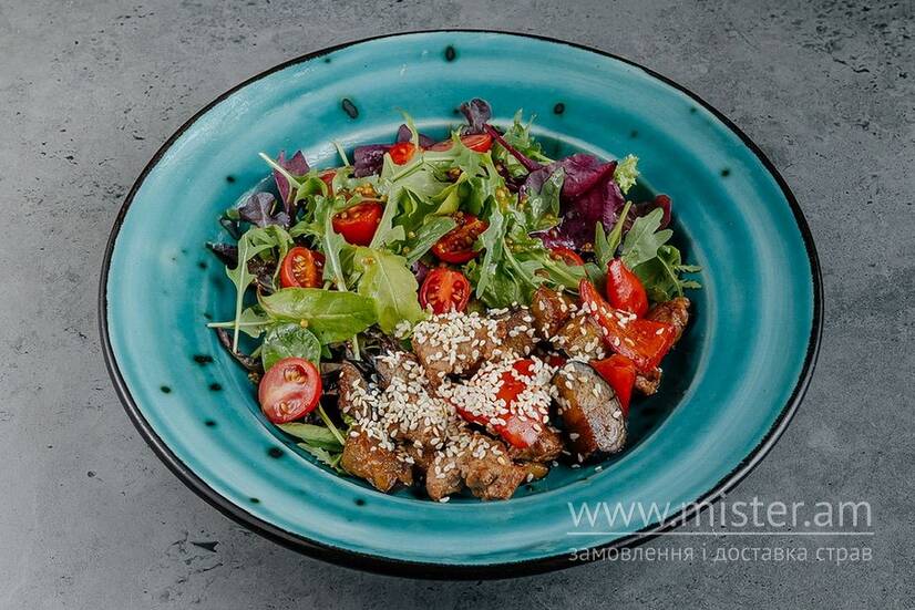 Телятина в теріякі, перець болгарський, мікс салатів, чері, баклажан, кунжут, заправка медово-гірчична.