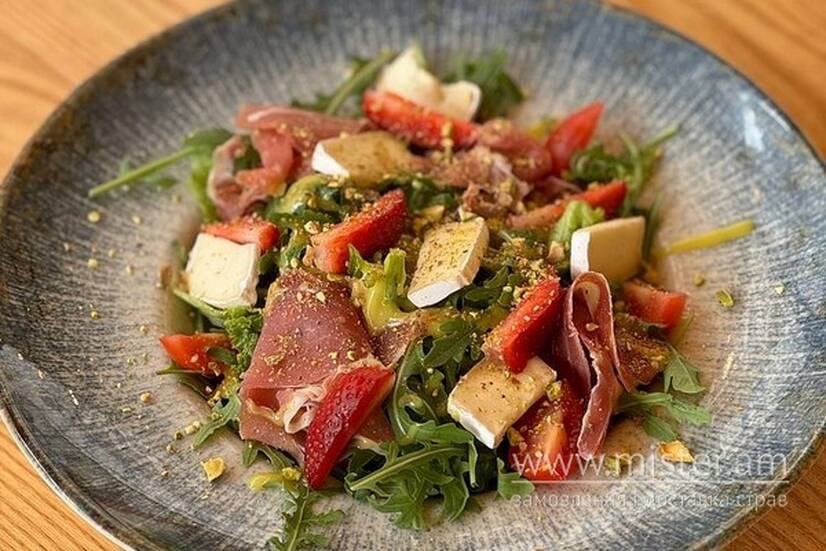 Прошуто, мікс салатів, сир Брі, сезонні фрукти, томати чері, фісташкова крихта, медово-гірчичний соус.