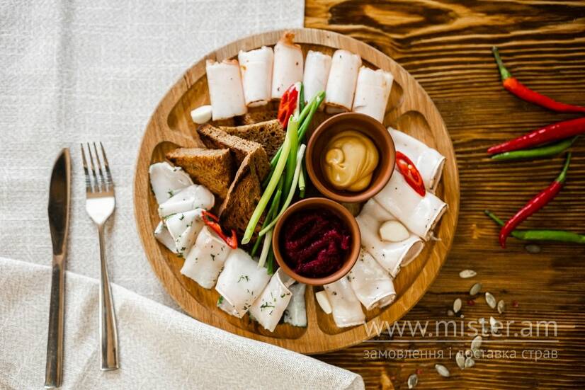 Чотири види маринованого сала, грінки з чорного хліба, хрін, гірчиця.