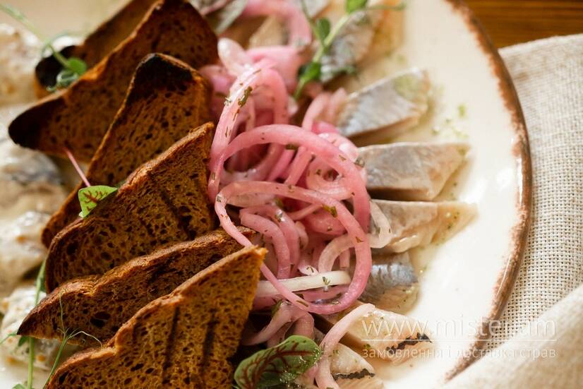 Грінки з чорного хліба, два види маринованого оселедця, цибуля.