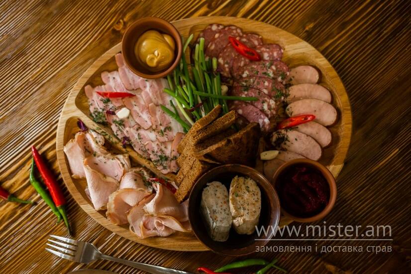 Буженина, підчеревина, ковбаса з конини та домашня, грінки з чорного хліба/