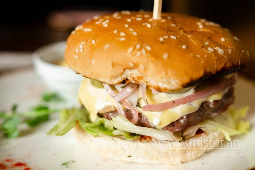 Котлета з яловичини, листя салату, плавлений сир, помідори, мариновані огірки, цибуля, соус Цезар.