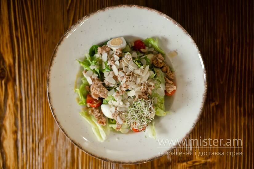 Листя салату, тунець, перепилині яйця, чері, медово-гірчичний соус.