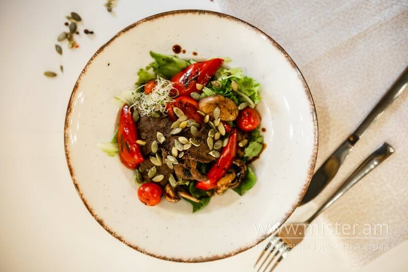 Листя салату, телятина, овочі гриль, кунжут, соус песто.