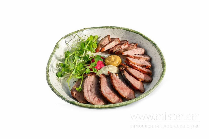 Томлений в печі язик, нарізаний шматочками, хрін, гірчиця.