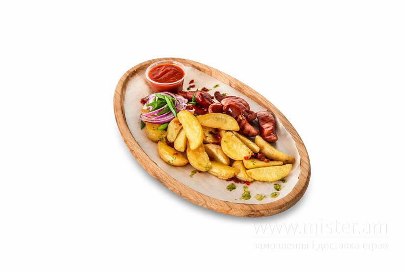 Смажена картопля по-селянськи в шкірці з баварськими ковбасками та фірмовим томатним соусом.