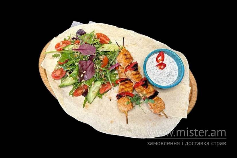 Курячий шашлик, мікс салату та соус дзадзикі.