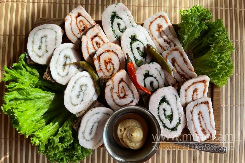 Рулети з сала з часником, паприкою, зеленню на чорному хлібі.