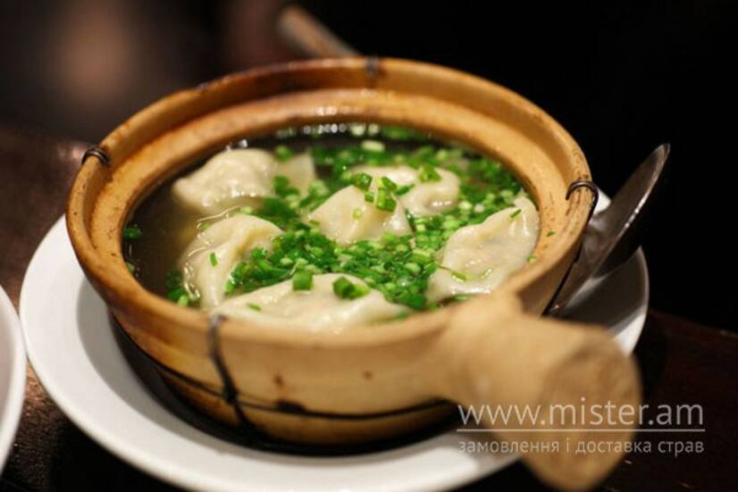 Курячий бульйон з пельменями власного виробництва.