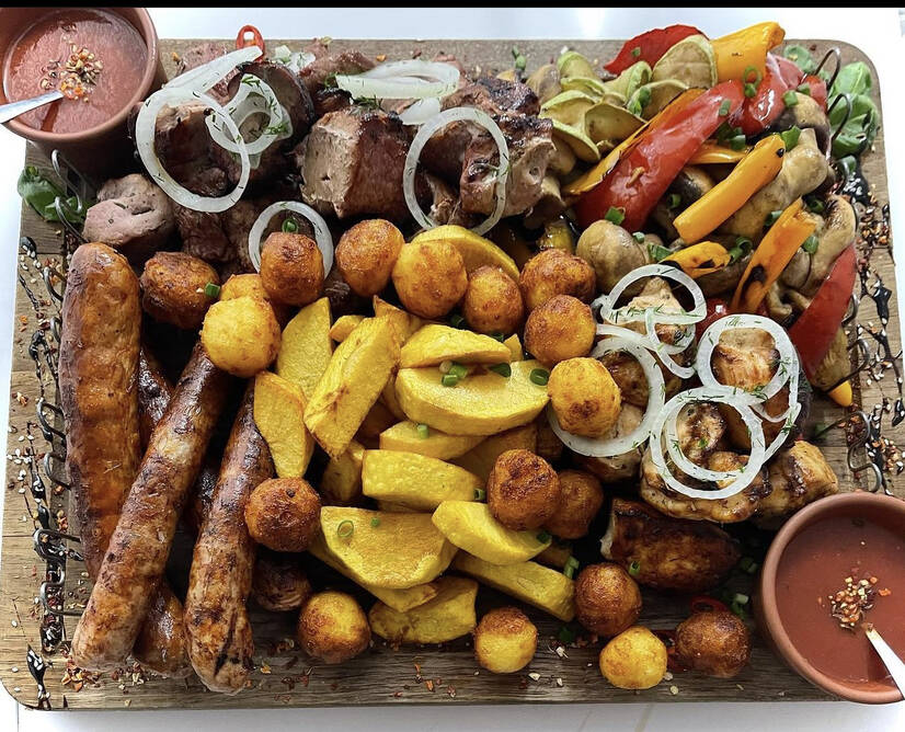 Шашлик свинний, курячий, ковбаски, картопля по-селянськи,соус.