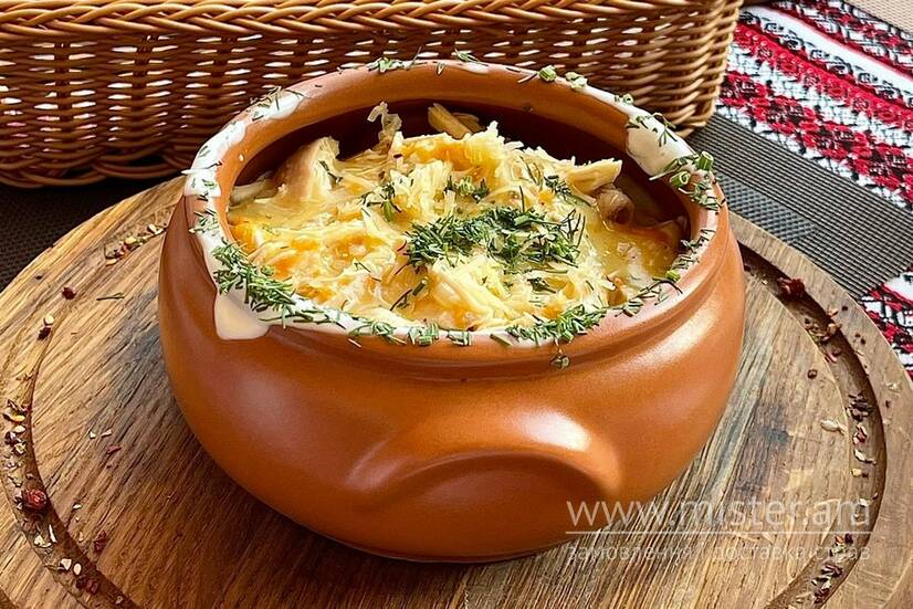 Вареники з картоплею запечені у соусі сметанковому з м`ясом курки.