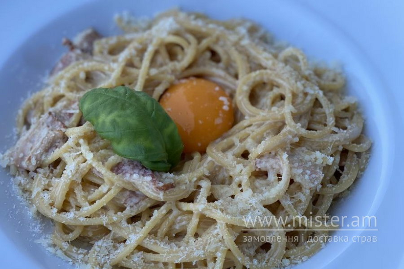 відварені спагетті, смажений бекон у вершковому соусі, жовток, сир пармезан