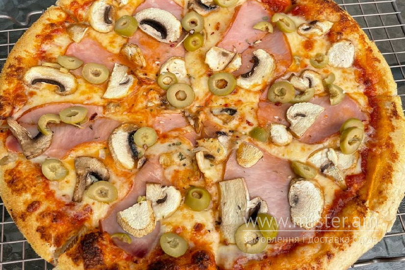 моцарела, оливки, шинка, гриби, свіжий базилік, томатний соус