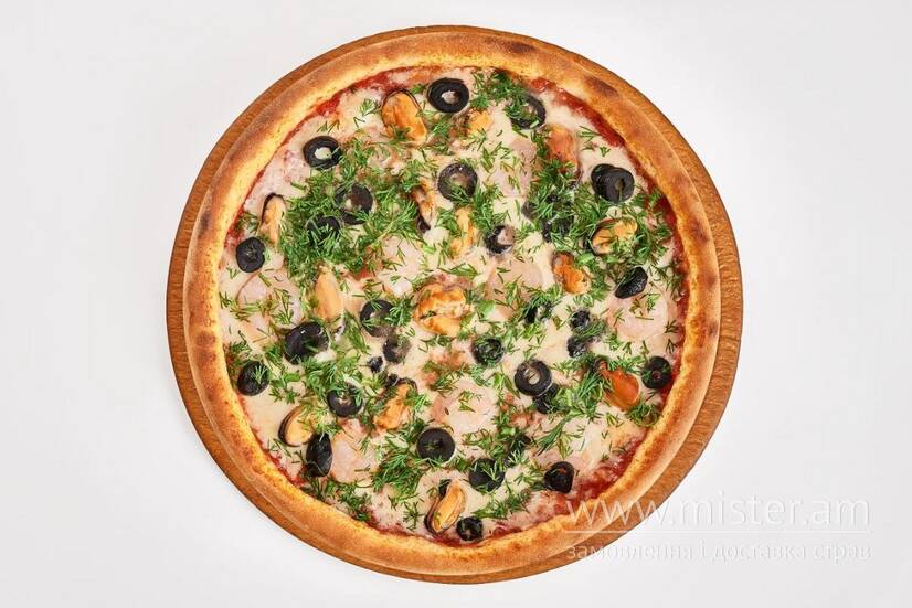 томатний соус, креветки, мідії. маслини, зелень, моцарела