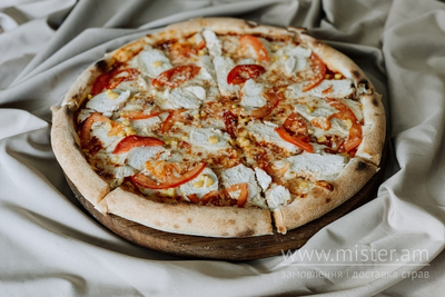 соус на вибір (оберіть з переліку), моцарела, філе куряче, томати, кукурудза, орегано, пармезан