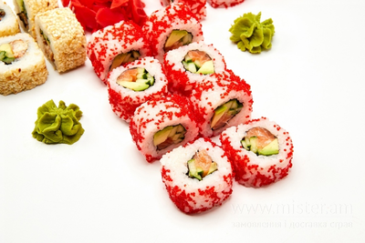 рол "Каліфорнія" з лососем, рол "Каліфонія" з копченим лососем, рол "Каліфорнія" з вугрем, імбир, васабі, соєвий соус