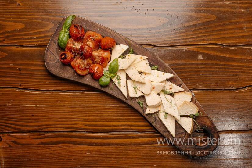 Будз копчений, будз з паприкою та будз з травами, подаємо з вʼяленими томатами та грилованими томатами чері.