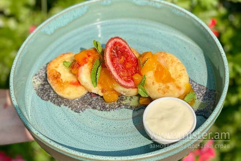 Солодкі сирники з тропічним міксом та маковим соусом
