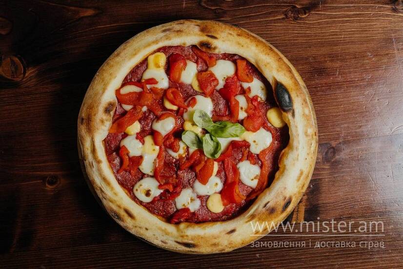 Салямі, печений перець, моцарела, пелаті, пармезан.