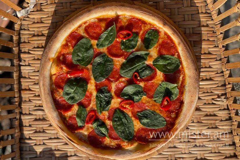 Гостра ковбаска, шпинат, пелаті, моцарела, чілі.